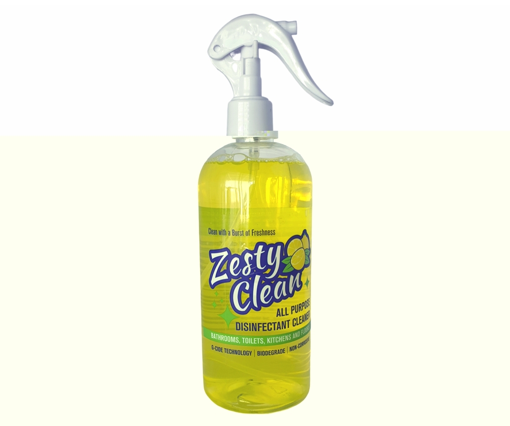 Introducing our cutting-edge All-Purpose Disinfectant Cleaner Zesty Clean - a clear, yellow solution with a refreshing lemon fragrance that not only cleans but goes above and beyond by incorporating advanced 2% Glutaral C11-C15 Pareth 9 technology. This versatile cleaner is designed to deliver unparalleled cleanliness and protection across a spectrum of environments, ensuring a safe and healthy space for all.
